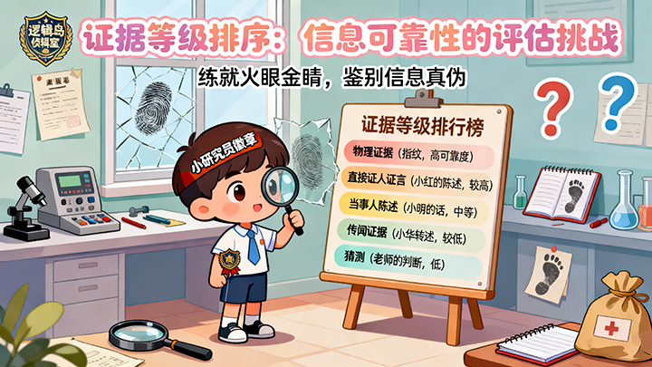 逻辑岛的小研究员们,今天我们要进行证据等级排序!区分‘我看见了’‘我听说的’‘我猜的’等证据可靠度。这需要可靠性评估、信息分类和批判性思维能力。准备好你的‘证据大脑’了吗?