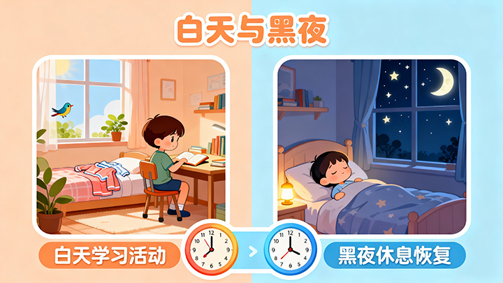 白天要起床学习活动,黑夜要休息睡觉恢复;白天要利用时间做事,黑夜要放松身心休息。小朋友,你能适应时间的规律性生活吗?