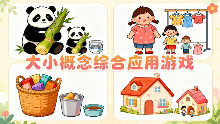 大熊猫用大竹笋,小熊猫用小竹笋;大房子住大家庭,小房子住小家庭。小朋友,在大小比较的乐园中,你需要综合运用大小概念解决实际问题。