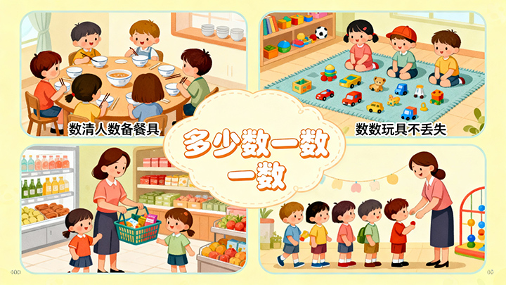 吃饭时要数数人数准备足够的碗筷,玩耍时要数数玩具确保不会丢失,购物时要数数物品确认购买数量。小朋友,你能在生活中实践数量管理吗?