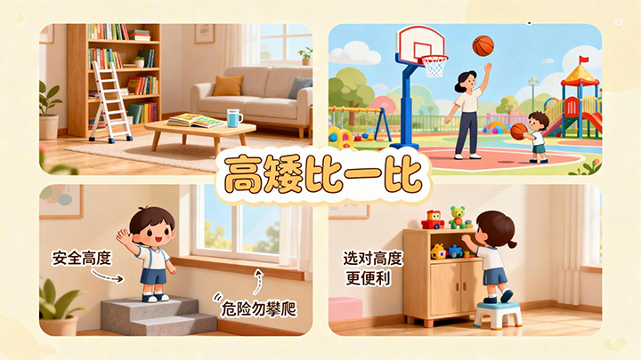 高高的书架需要梯子才能拿到书,矮矮的茶几伸手就能拿到东西;高高的篮球架适合大人投篮,矮矮的儿童篮框适合小朋友投篮。小朋友,你能在生活中应用高度知识吗?