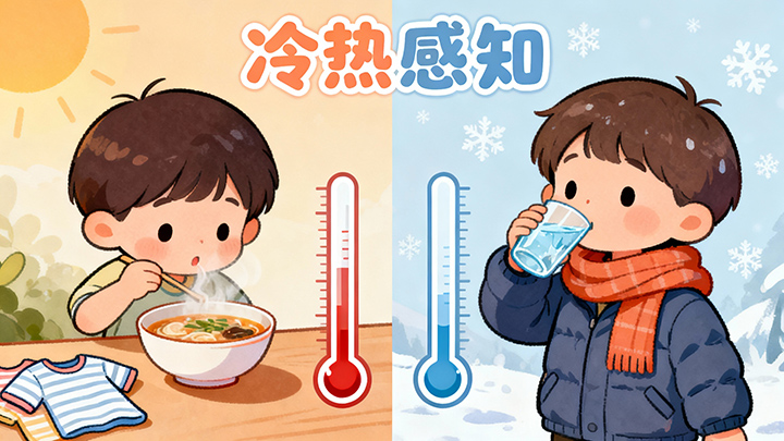 热汤要吹凉了再喝避免烫伤,冰水要慢慢喝避免冰到牙齿;夏天要穿薄衣服保持凉爽,冬天要穿厚衣服保持温暖。小朋友,你能掌握温度适应的生活智慧吗?