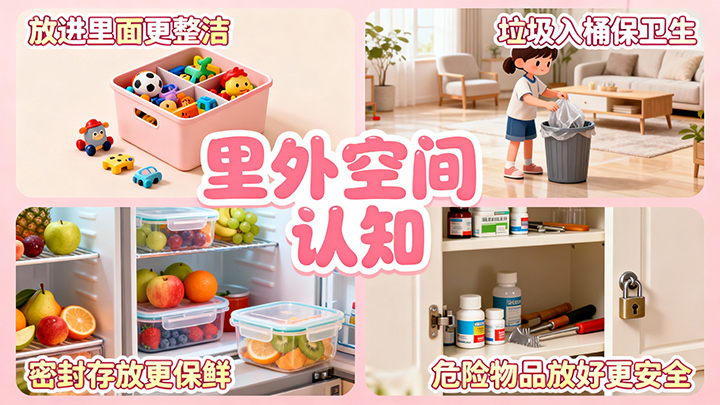 玩具放在玩具箱里面整洁有序,书本放在书架里面方便查找;垃圾放在垃圾桶里面保持卫生,食物放在冰箱里面保鲜保存。小朋友,你能在生活中应用里外空间知识吗?