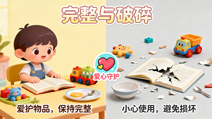 完整的玩具要好好爱护避免摔坏,完整的书本要轻轻翻页避免撕破,完整的餐具要小心使用避免打破。小朋友,你能承担维护物品完整的责任吗?