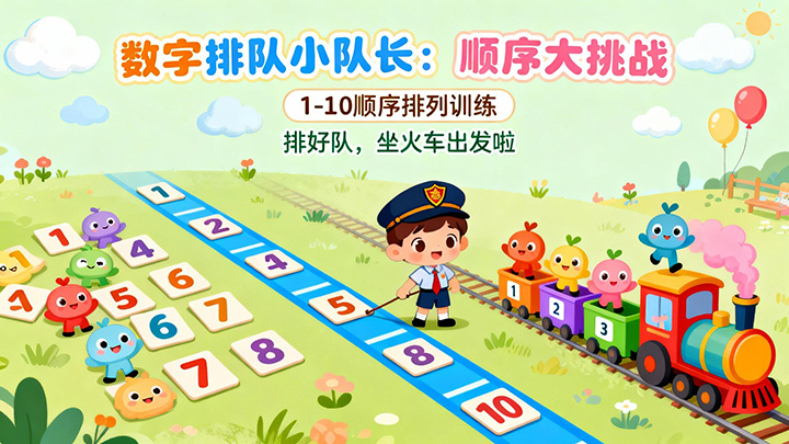 游戏中,数字宝宝们变成了一张张可爱的数字卡片,但顺序都打乱了。孩子们需要扮演“小队长”,把这些数字卡片拖动到一条虚拟的“排队线”上,按照从1开始的顺序依次排列。游戏会从1-5开始,逐步增加到1-10、1-20。当数字排好队后,还会有一个小火车开过来,数字宝宝们会按顺序跳上车厢!