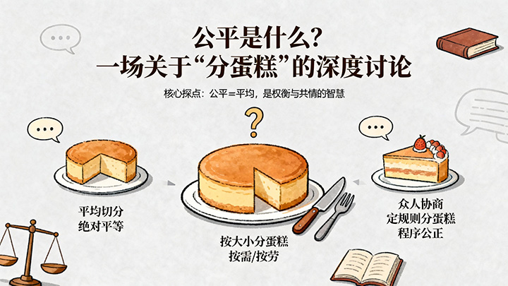“这不公平!” 这是我们经常听到或说出的一句话。但究竟什么是公平?是每个人都分到一样大小的一块蛋糕(平均),还是按食量分(按需),或是按谁做蛋糕的功劳分(按劳)?今天,我们通过一个经典的“分蛋糕”思想实验及其多种变形,深入探讨“公平”与“平等”这两个紧密相关又时常冲突的概念。你会发现,公平不是一个简单的公式,而是一个需要在具体情境中权衡智慧、同理心和规则的复杂问题。