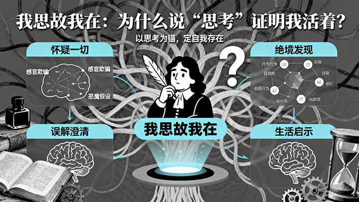 “我思故我在”——这是法国哲学家笛卡尔留给世界最著名的哲学命题。听起来有点绕口,但它试图回答一个最根本的问题:在一切都可以被怀疑的时候,有什么是绝对确凿无疑的? 今天,我们不把它当作一句高高在上的名言,而是亲自重走一遍笛卡尔的怀疑之路,体验用纯粹的逻辑思考来锚定自身存在的过程,并探讨“思考”本身无可替代的价值和力量。